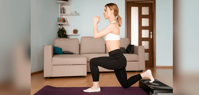 Forward lunge should be one of the first exercises of your legs workout at home. They target the large muscle groups in your legs – quadriceps, hamstrings, and calves. They also work your abs and stabilize the core. Make forward lunges a staple of your home workout to work the glute muscles and tone your buttocks. Overall, this exercise is great for hip flexibility and balance.